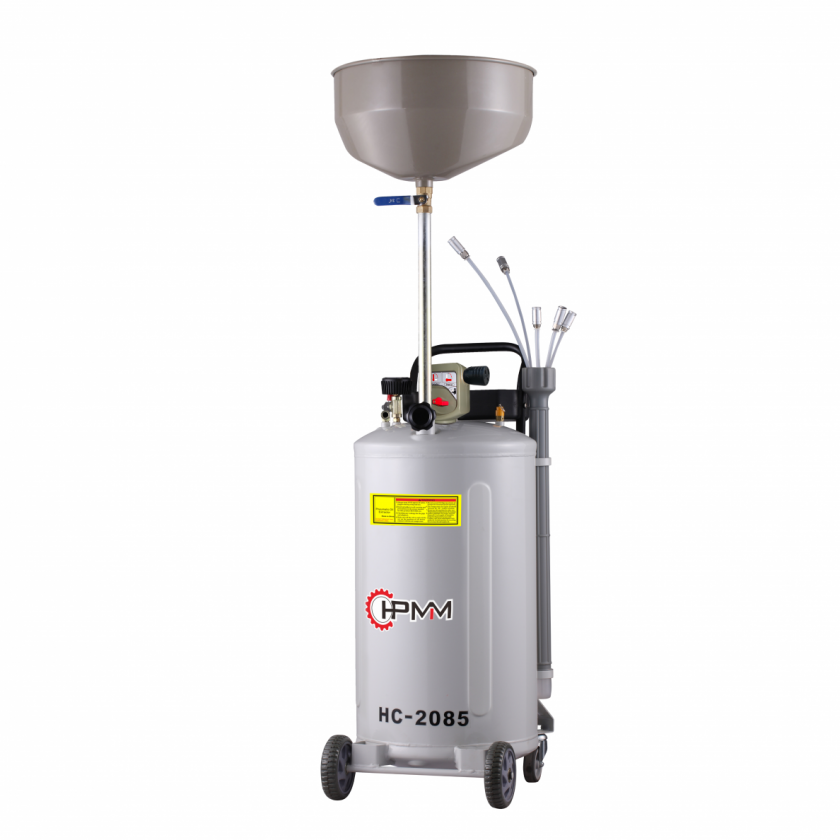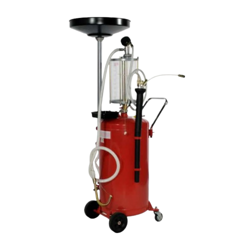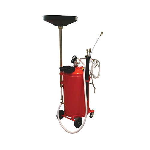 Използва се както за улавяне на масло по време на ремонт на превозни средства, така и за извличане на масла с помощта на сгъстен въздух. Количеството извлечено масло, както и неговото качество, могат удобно да се проверят с помощта на прозрачен цилиндър с пръчка за измерване. След затваряне на клапана маслото може да се изпомпва от събирателния съд със сгъстен въздух с помощта на маркуч. Оборудван с дръжка и колела за лесно преместване. Уредът съдържа удължители: - Cu, 5 mm, дължина 800 mm, скорост на засмукване 1,9 l/min - Cu, 6 mm, дължина 800 mm, скорост на засмукване 3,2 l/min - PVC, 6 mm, дължина 700 mm, скорост на засмукване 4,2 l/min - PVC, 8 mm, дължина 700 mm, скорост на засмукване 6,2 l/min - PVC, 6 mm, дължина 800 mm, скорост на засмукване 3,7 l/min - PVC, 8 mm, дължина 800 mm, скорост на засмукване 5,2 l / мин. Минимална височина: 1400 mm Обща височина при максимален удължаване на телефонния прът: 1680 mm Диаметър на събирателната купа: 400 mm Обем на събирателната купа: 16 l Обем на смукателния цилиндър: 9 l Обем на събирателния съд : 65 l Входящо налягане на сгъстен въздух за отвеждане: 6 8 bar Входящо налягане на сгъстен въздух за изпомпване: 7 10 bar Разход на въздух: 150 l / min Вакуум: -1 0 bar Фитинг за подаване на сгъстен въздух: 1/4. Скорост на засмукване (маркучи 8 mm, температура на маслото 60 °C): 6,5 l/min Работна температура: 40 60 °C Смукателен маркуч: 19 mm, 1,5 m Маркуч за източване: 19 mm, 1,5 m Нето тегло: 21,3 kg